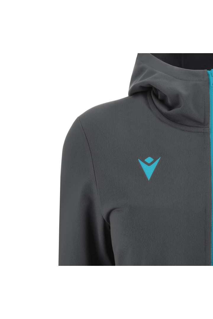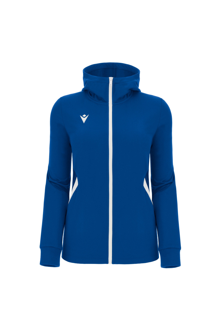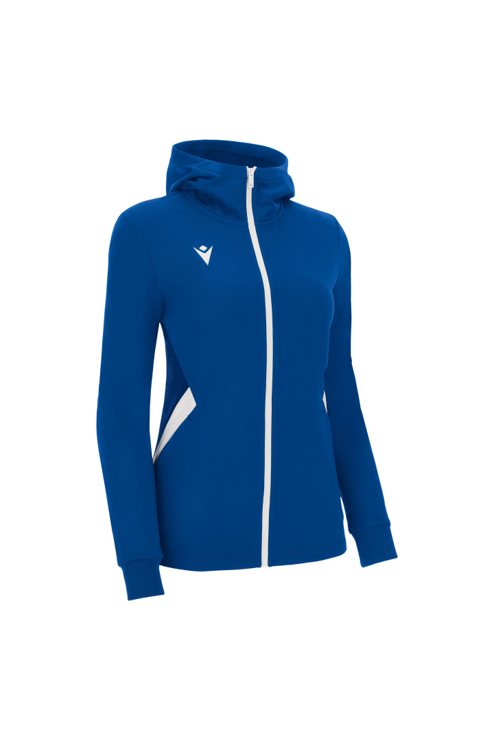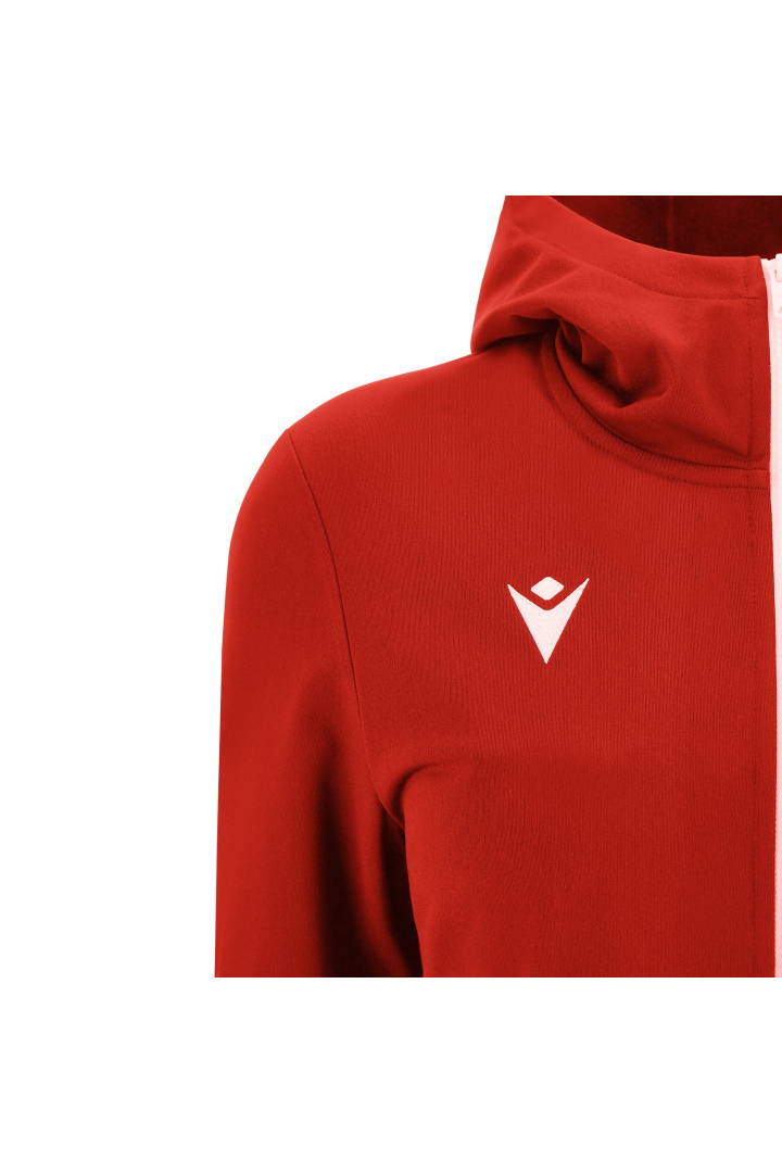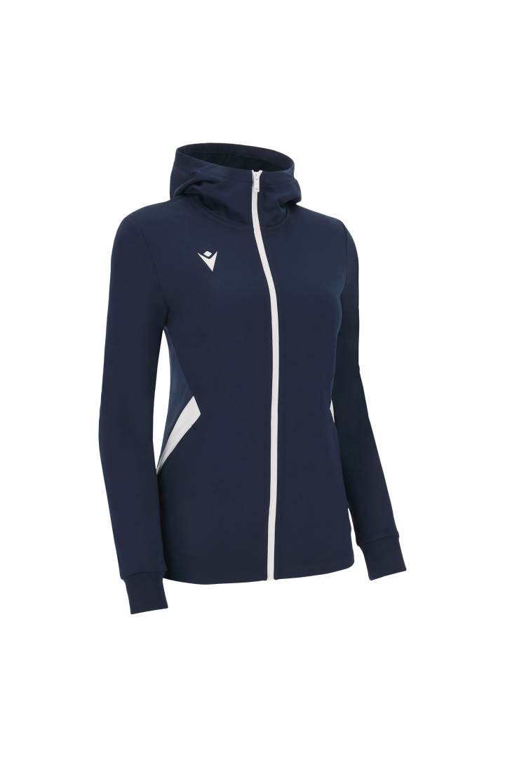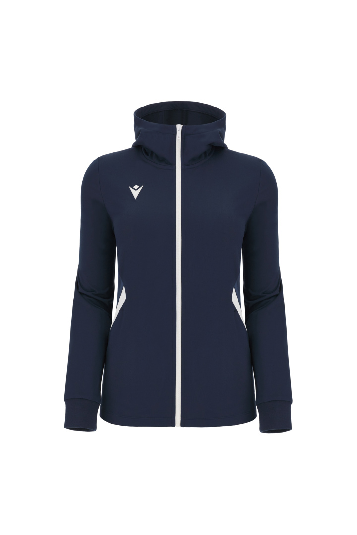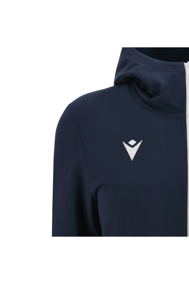 Haut de représentation à capuche pour femme en tissu Polydry**. Doté d'une fermeture à glissière centrale complète moulée sous pression et tirette avec le Macron Hero en caoutchouc. Grandes poches latérales avec fermeture à glissière inversée en nylon. Les poignets sont en tricot.