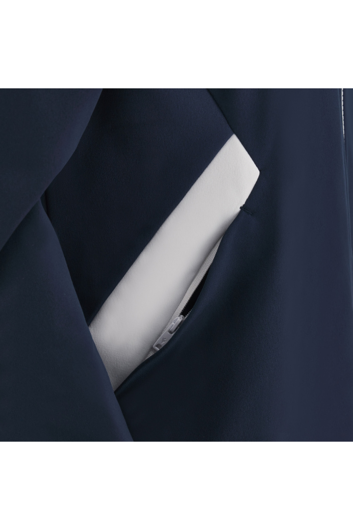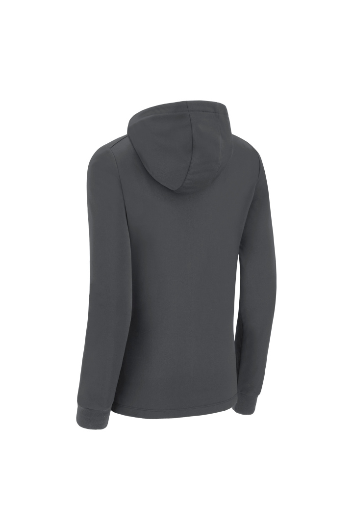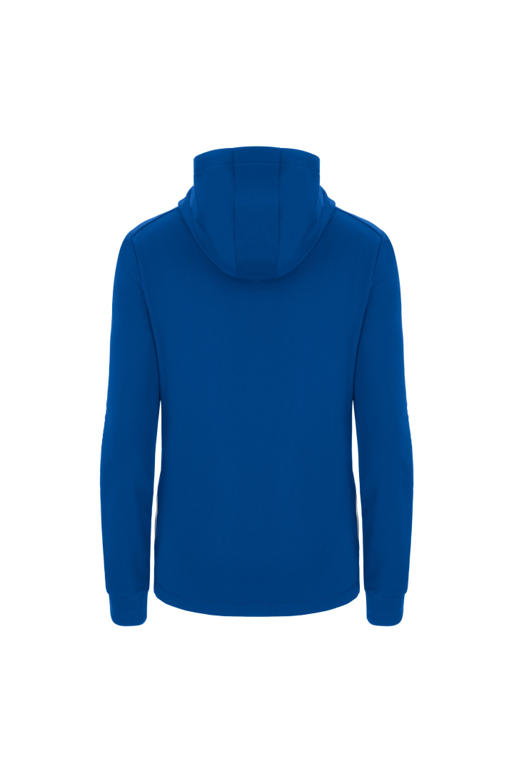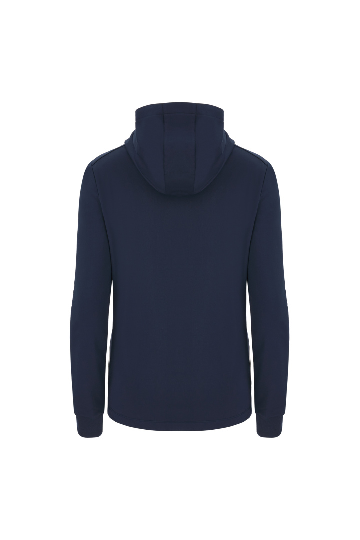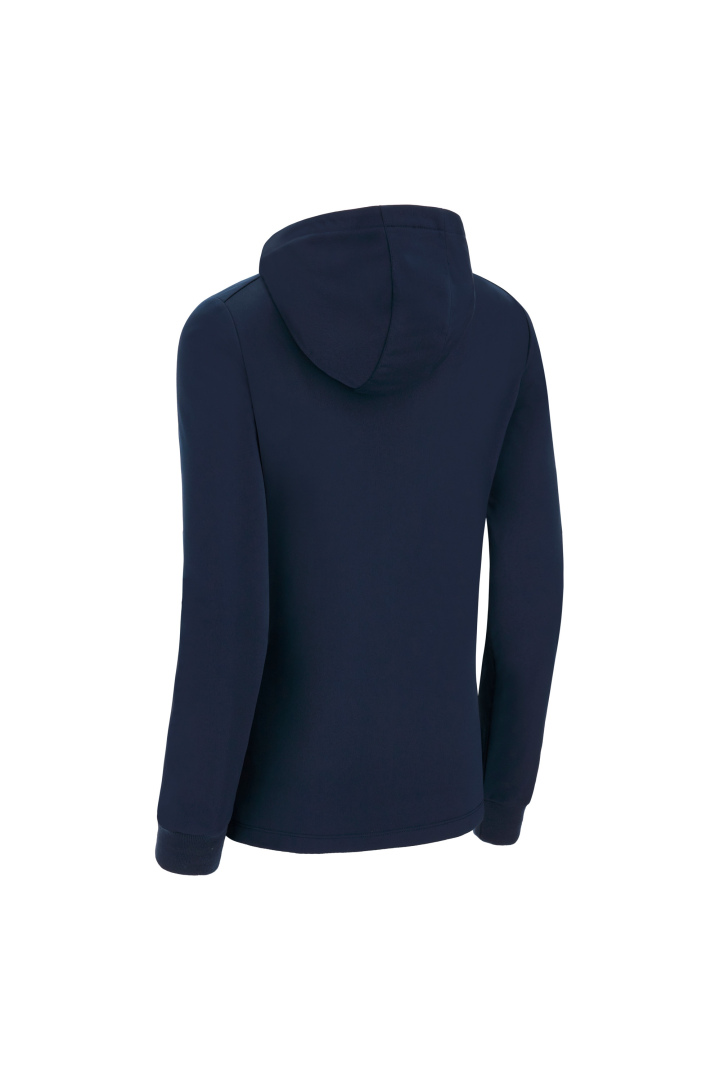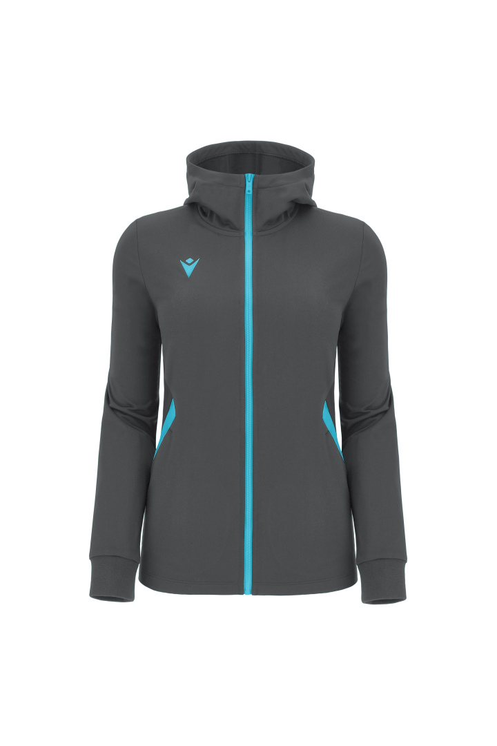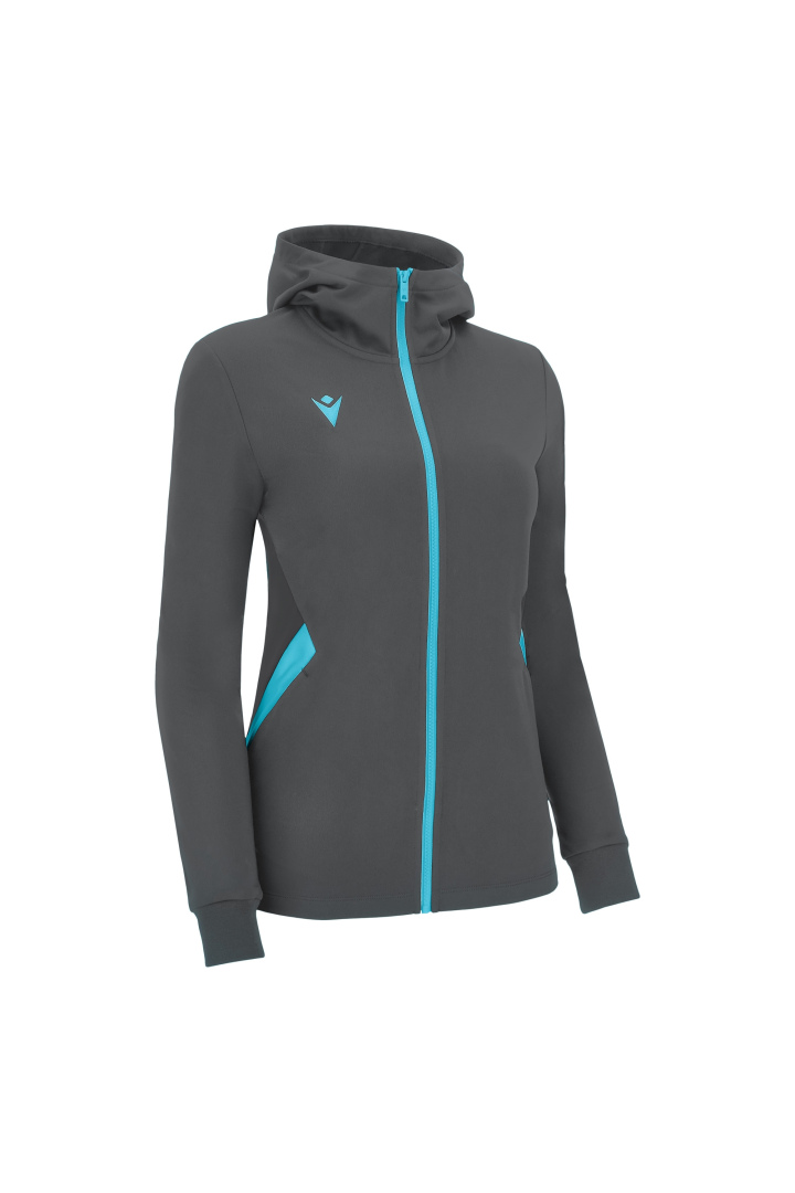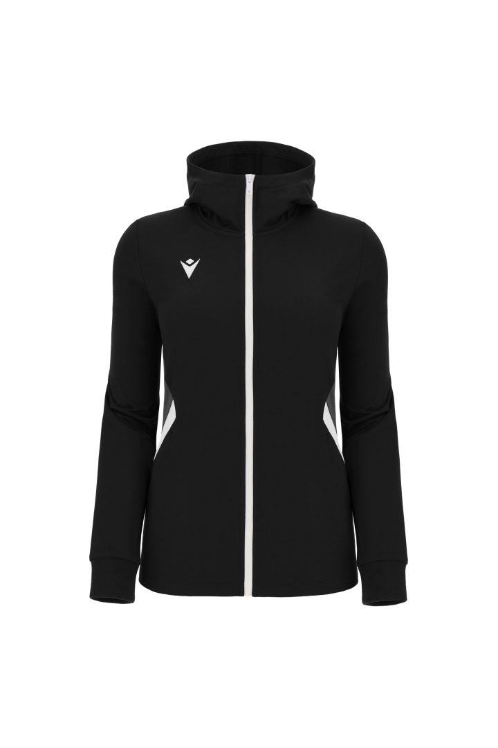 Haut de représentation à capuche pour femme en tissu Polydry**. Doté d'une fermeture à glissière centrale complète moulée sous pression et tirette avec le Macron Hero en caoutchouc. Grandes poches latérales avec fermeture à glissière inversée en nylon. Les poignets sont en tricot.